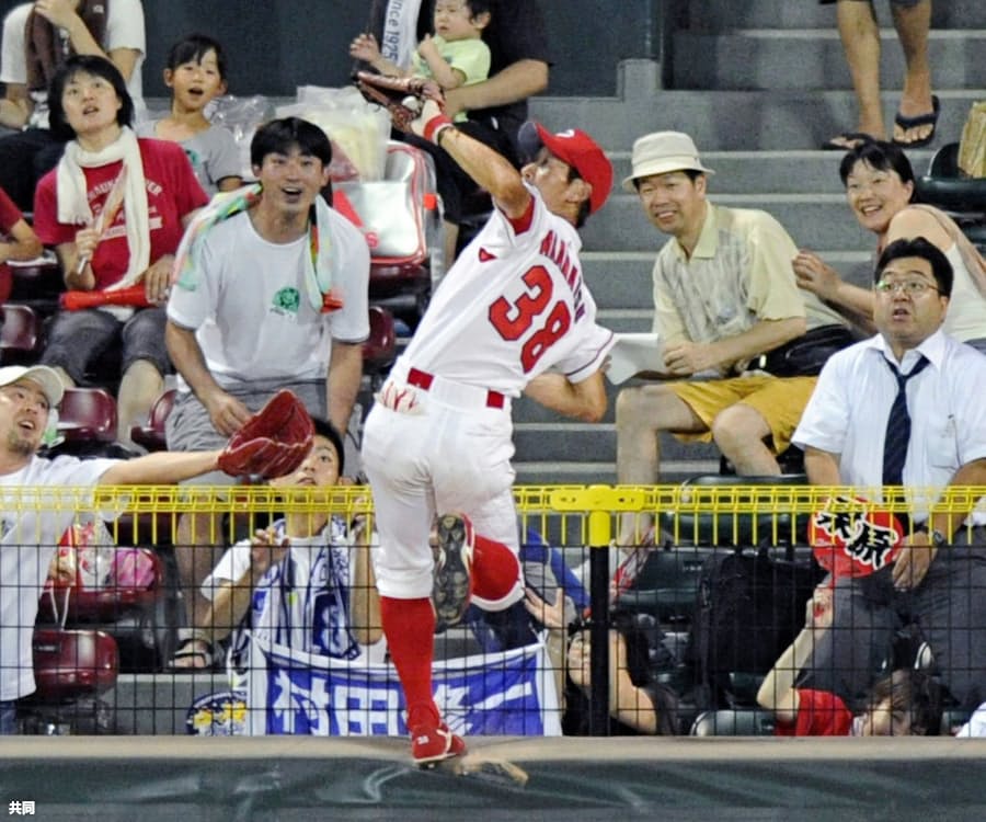 プロ野球 カープ天谷選手のスーパープレー フェンスに登ってホームランキャッチ スパイダーマン